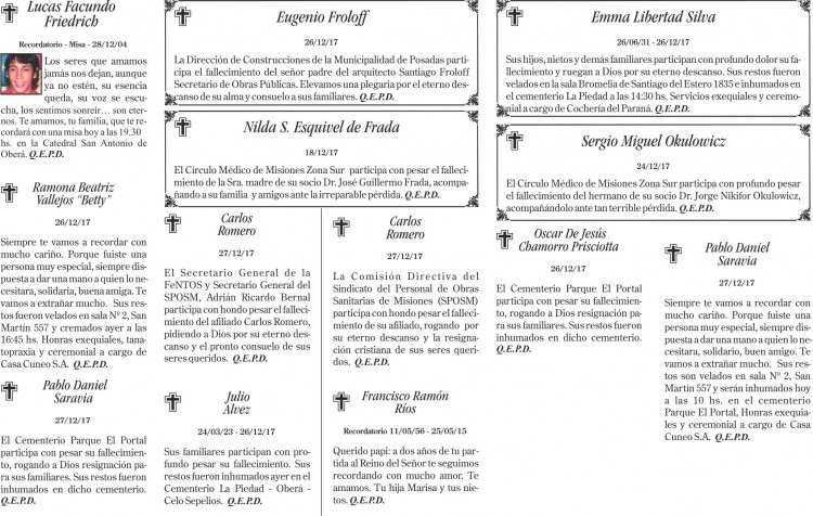 Fúnebres del jueves 28 de diciembre de 2017