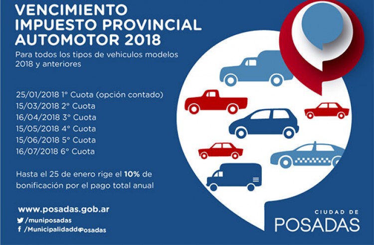 La Municipalidad de Posadas comunica el cronograma de vencimientos de las cuotas del Impuesto Provincial al Automotor (IPA) para todos los tipos de vehículos modelos 2018 y anteriores.