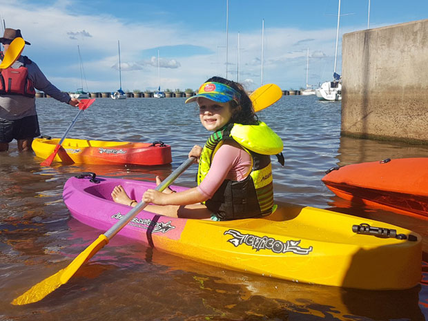 Al ver a la niña de Luciana Amado Siry, Sury, con su chaleco salvavidas y el remo en mano, y con una gran sonrisa decidí que ésta sería la propuesta del verano para los más pequeños. El profesor Eduardo Bruzzone, a quien conocen como Peto, se mete al agua con ellos y explica: Lo mío es puramente recreativo, quiero que a los chicos les guste estar en el agua, les guste explorar en kayak, que puedan subirse y resolver cualquier situación que se les pueda presentar. Una de las cosas es el auto-rescate que les encanta y lo que más les enseño son habilidades.