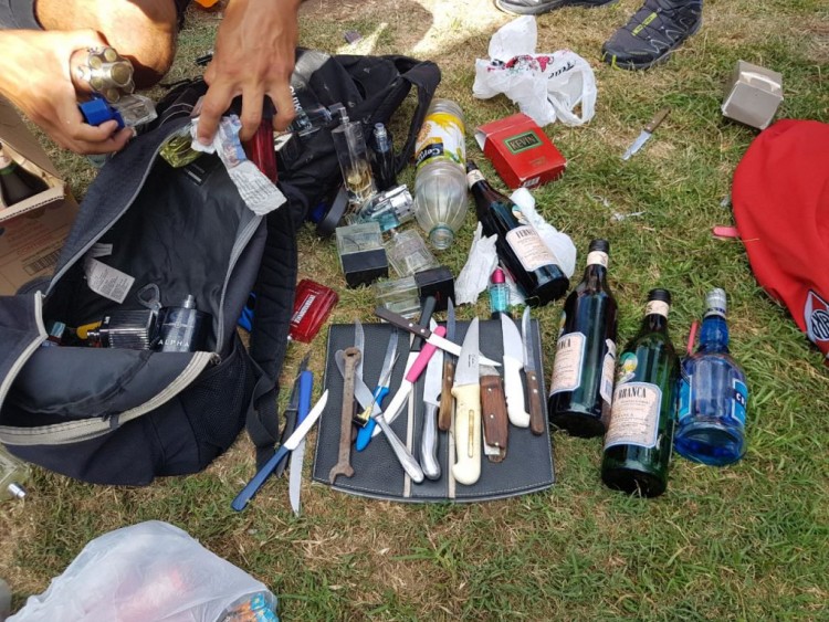 La policía informó que se secuestraron en total “330 botellas de bebidas alcohólicas, diversos artefactos pirotécnicos, 52 elementos punzocortantes, marihuana y varias dosis de cocaína”.