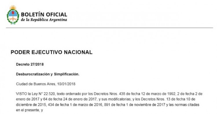 El Decreto de Necesidad y Urgencia (DNU) 27/2018, firmado por el presidente Mauricio Macri bajo el título de desburocratización y simplificación del Estado, fue girado al Congreso. El documento, de más de 150 fojas, ingresó por el Senado.