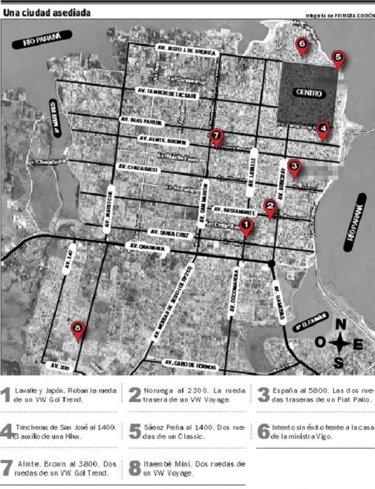 Ese fue apenas uno de los casos registrados durante la última semana en la capital provincial, tal como quedó reflejado en el mapa de la ciudad que acompaña este artículo. Sobre la banda, los detectives no descartan nada: hablan de una banda con conexiones en otra provincia o malvivientes que encontraron en las ruedas un nuevo nicho delictivo.