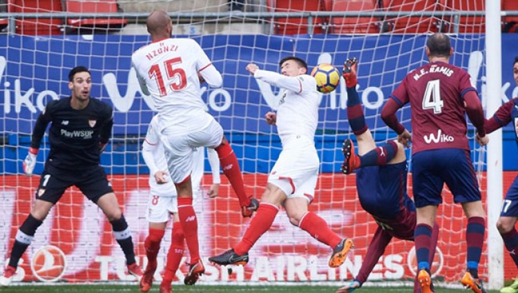 La defensa sevillista tuvo muchos problemas ante un Eibar que se instaló en el campo contrario con las llegadas de Fabián Orellana y el japonés Takashi Inui, acompañando a los atacantes Kike García y Charles.