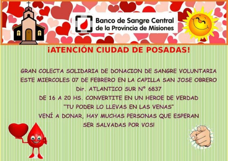 Bajo el lema “Con una donación podes salvar tres vidas. Convertite en Héroe”, se hará una colecta de sangre este miércoles 7 en la Capilla San José Obrero, en la calle Atlántico Sur, de 16 a 20 horas.