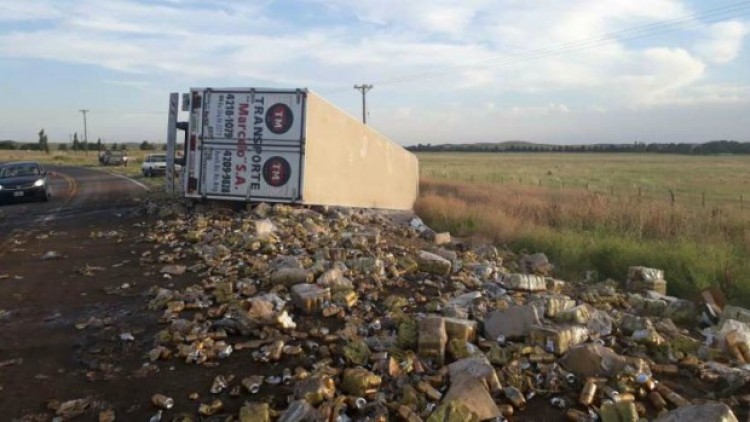 El hecho ocurrió en la tarde del jueves, cuando el camión Scania con acoplado que circulaba de norte a sur no pudo tomar una curva. El camión volcó y las latas quedaron tiradas sobre la cinta asfáltica, en tanto el acoplado quedó sobre parte de la ruta 9.