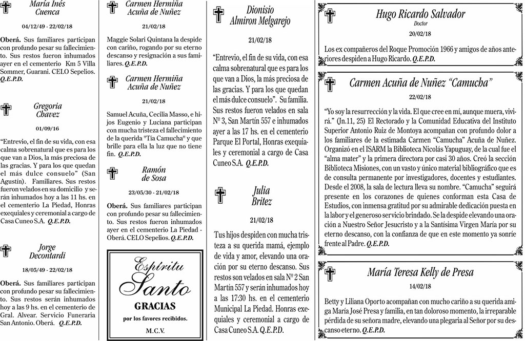 Fúnebres del viernes 23 de febrero de 2018