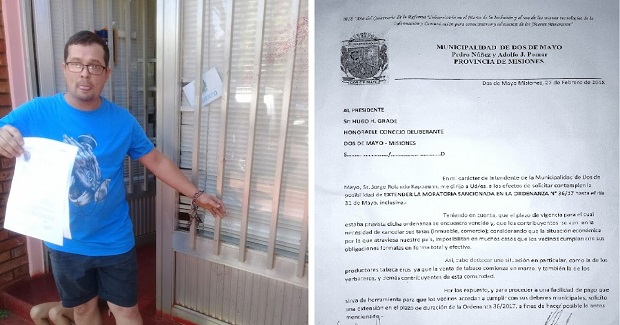 Un comerciante decidió encadenarse el lunes a un ventanal de la comuna local, ya que fue a renovar su licencia de conducir y no pudo realizar el trámite por no tener los impuestos al día. Pide que se derogue la Ordenanza 36/17.