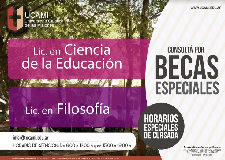 Se otorgarán becas especiales, financiadas por el Fondo de Becas de la Universidad Católica de las Misiones, para egresados del nivel secundario y docentes que deseen iniciar o continuar estudios universitarios. Las inscripciones continuarán abiertas durante todo marzo.