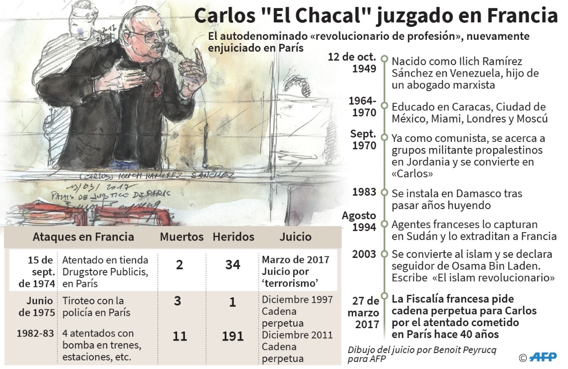 Ramírez Sánchez, que fue durante años uno de los fugitivos más buscados del mundo, purga ya dos condenas a perpetuidad por un triple homicidio perpetrado en 1975 en París y cuatro atentados con explosivos cometidos en los años 1980, que dejaron 11 muertos y 191 heridos.