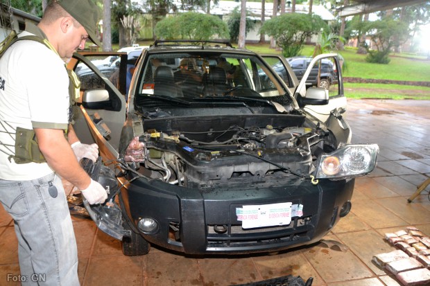 Al inspeccionar la camioneta Ford modelo Ecoesport en la que se trasladada una pareja y sus dos hijos, efectivos de la Unidad de Procedimientos Judiciales de Eldorado notaron irregularidades en su carrocería con remoción de los tornillos correspondientes a los laterales ubicados sobre los guardabarros delanteros e igualmente en las uniones de los faros traseros.