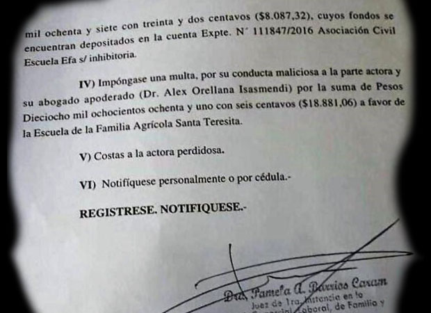 Se trata de la EFA Santa Teresita de Leandro N. Alem. La jueza Civil y Comercial de primera instancia Pamela Barrios dictó el levantamiento de los embargos librados contra la escuela y ordenó el pago de 8.087,32 pesos en favor de la institución.