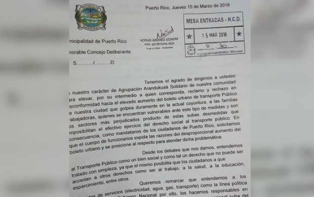 Jóvenes de la agrupación Arandukuaá Solidario presentaron una nota al Concejo Deliberante local en reclamo por el elevado aumento en el boleto urbano de transporte público que golpea duramente en la economía de las familias, expresaron en el texto.