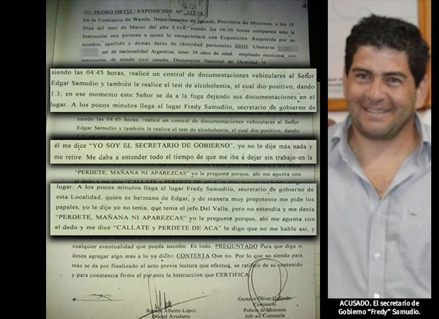 Según la exposición que realizó un empleado municipal en la comisaría local, “Fredy” Samudio lo habría maltratado porque sometió a su hermano a una alcoholemia. El intendente Felipe Jeleñ dijo que ambos siguen en función y garantizó que no habrá represalias.Un inspector municipal de esta ciudad denunció el domingo a primera hora en la comisaría local que fue maltratado por el secretario de Gobierno, Fernando “Fredy” Samudio, luego de un control de tránsito donde detuvo el vehículo de su hermano y le retuvo la documentación porque habría arrojado resultado positivo el test de alcoholemia.