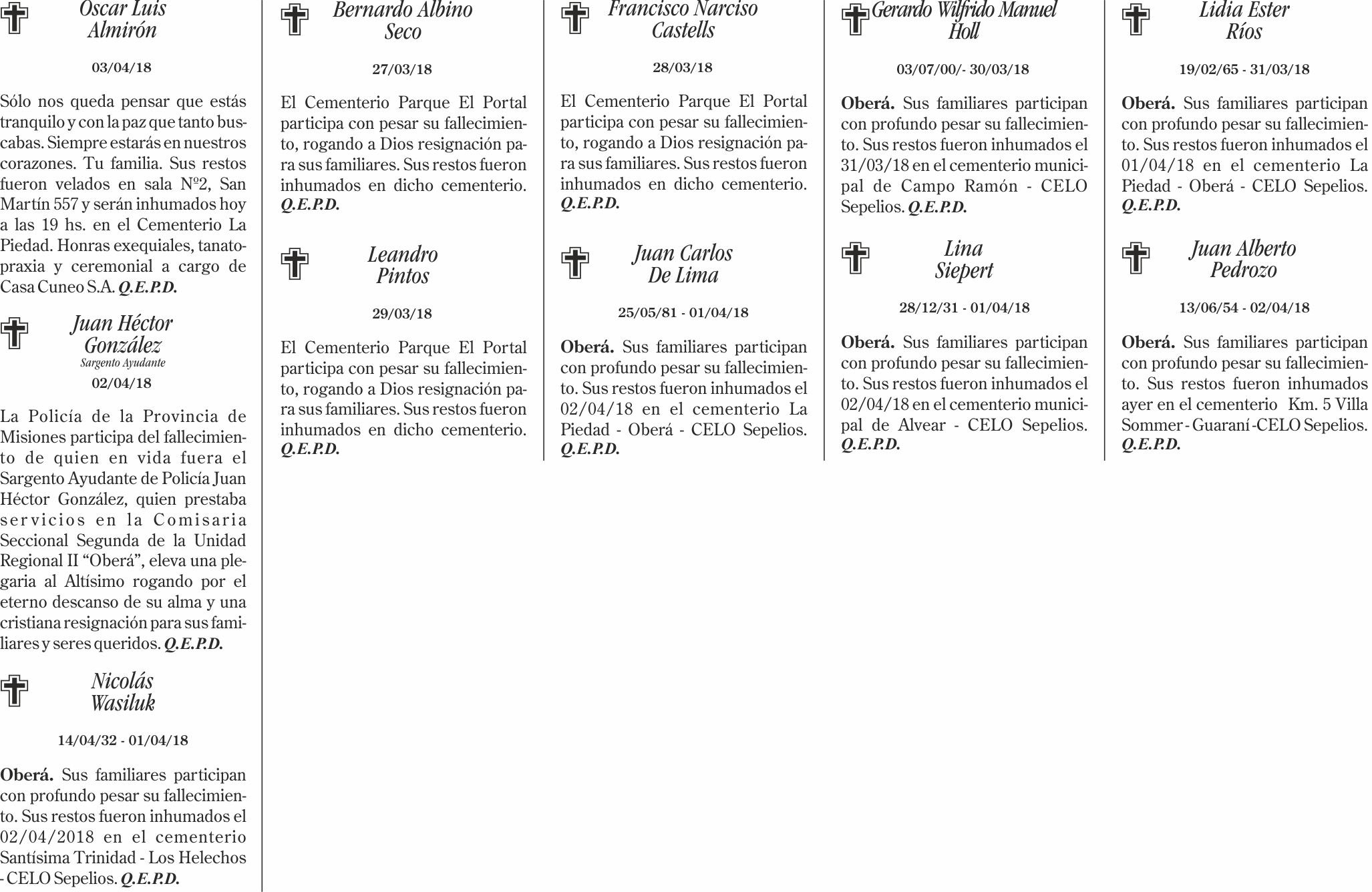 Fúnebres del miércoles 4 de abril de 2018