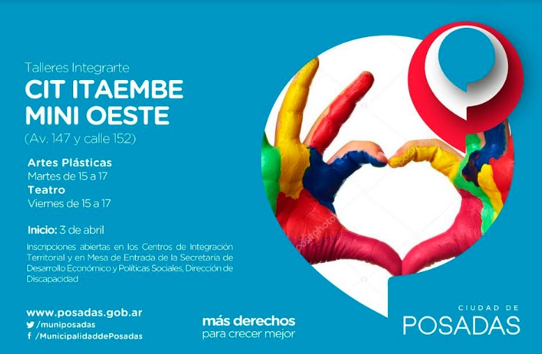 En el marco de acciones de inclusión social que lleva adelante la Municipalidad de Posadas, se dio inicio a un ciclo de talleres de artes plásticas y teatro destinado a personas con discapacidad. Los mismos están destinados a chicos desde 14 años sin límite de edad y se pueden realizar en distintos puntos de la ciudad como Villa Cabello, Itaembé Miní Oeste y la Parroquia Sagrada Familia.