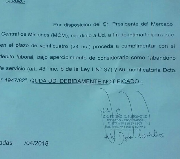 Trabajadores del Mercado Central de Misiones, organizados en ATE, que se encuentran en paro por tiempo indeterminado luego de la brutal agresión física que recibió en su puesto laboral el delegado Gustavo Ortiz – el pasado 23 de marzo-, comenzaron a recibir aprietes por parte del Presidente del Mercado Central, Jorge Brignole, quien sin respetar el legítimo derecho a huelga y desoyendo las severas razones y exigencias que los trabajadores plantean, comenzó a enviar cédulas de intimación para que los trabajadores en huelga se presenten a trabajar “bajo apercibimiento de considerar abandono de servicio”. Estas notificaciones están siendo enviadas a los domicilios particulares de los trabajadores.
