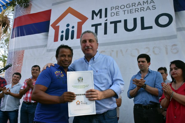 El gobernador Hugo Passalacqua, acompañado de miembros de su Gabinete que representan a todas las áreas de Gobierno que tienen participación en el Programa Mi Título iniciado ya en 2016, la intendente local, Silvia Estigarribia y jefes comunales de localidades vecinas, entregó en manos a los hasta ahora ocupantes, los títulos que los convierten en propietarios de su tierra.