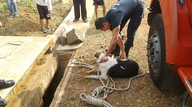 Este sábado la división Bomberos Zona Sur intervino en calle Pasaje Brasil y Ameghino de Posadas donde vecinos avisaron que un perro llamado Mirko cayó y quedó atrapado en una alcantarilla de más de dos metros de profundidad.