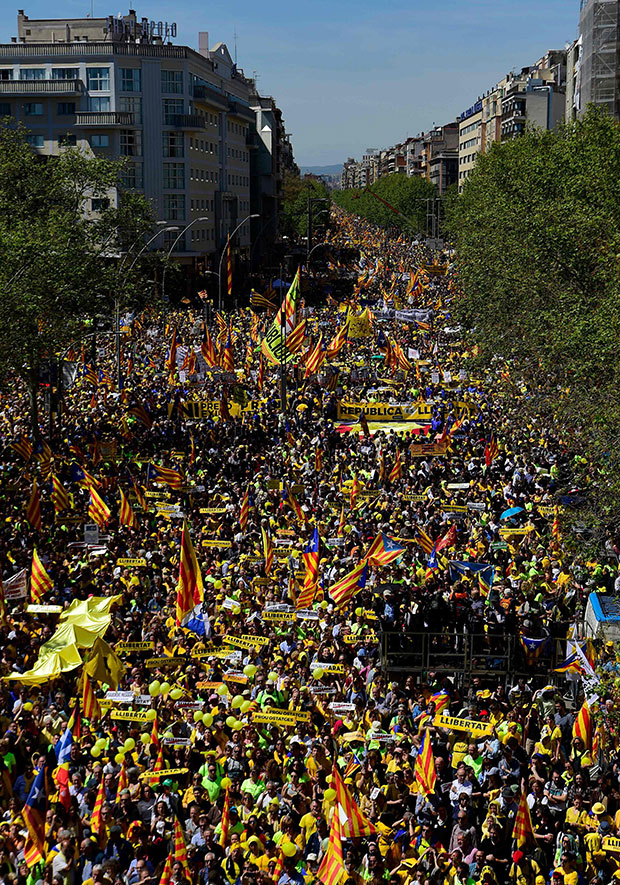 Al grito de "libertad para los presos políticos" centenares de miles de personas se manifestaron este domingo en Barcelona para protestar contra el encarcelamiento de nueve dirigentes independentistas catalanes, acusados de rebelión.