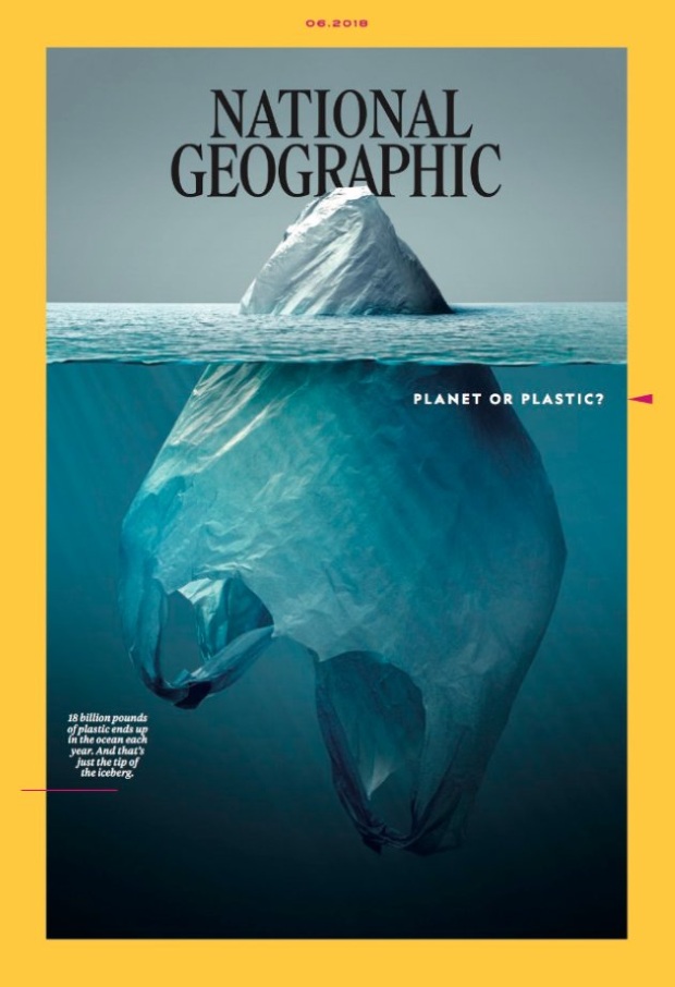 Con el sencillo titular Planet or plastic (¿Planeta o plástico?), la publicación muestra una creación del artista mexicano Jorge Gamboa que fusiona un iceberg con una bolsa de plástico.