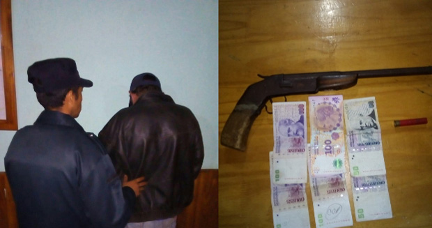 A punta de pistola un hombre de 43 años asaltó anoche un local en Dos de Mayo. Robó el dinero al empleado y se dio a la fuga. Fue atrapado más tarde por efectivos policiales. El robo tuvo lugar en un comercio del barrio Pueblo Illia. Un empleado del local denunció que un hombre armado ingresó al comercio y tras apuntarlo se alzó con el dinero.
