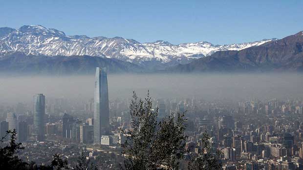 En invierno, la capital chilena sufre de contaminación ambiental debido a su condición geográfica, al estar enclavada en un valle rodeado de cerros y la imponente Cordillera de Los Andes.