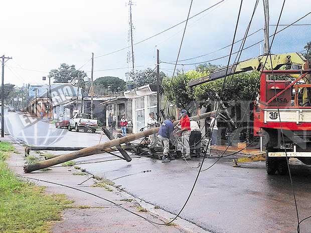 Tres postes de baja tensión sobre la colectora Favaloro y cuatro o cinco de media y baja tensión sobre la Alberdi se precipitaron cuando un rayo golpeó fuerte sobre el tendido y luego una ráfaga de viento lo terminó de derribar, provocando una caída en forma de dominó.