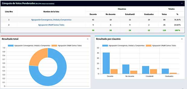 La lista Convergencia, Unidad y Compromiso, el espacio de continuidad oficialista de la gestión encabezada por Javier Gortari, cuya candidata fue Alicia Bohren, decana de mandato cumplido en la Facultad de Ciencias Forestales, se impuso con el 76,36% de los votos, por sobre María Yurkevich, decana saliente de la Facultad de Ciencias Económicas, quien encabezó la lista opositora UNaM Somos Todos.