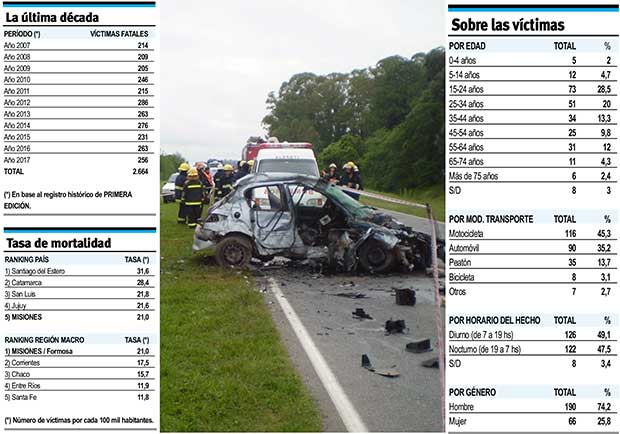 Los números de la Agencia coinciden con los ya informados por PRIMERA EDICIÓN en su informe anual. La estadística concluye que en Misiones, durante 2017, se registraron 256 muertes viales. Ese número, en contraste con los 1.218.771 habitantes con los que cuenta la provincia, arrojan el escalofriante número de 21 muertos por cada 100 mil misioneros.