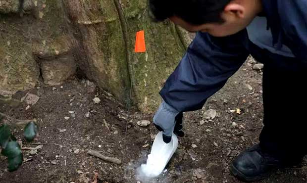 Avanzan madriguera por madriguera, colocando en cada una pequeñas piedritas de hielo seco (llamado también nieve carbónica), que es en realidad gas carbónico congelado, en forma sólida.