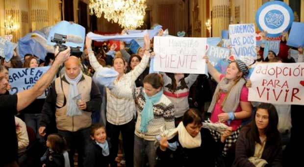 Antes de que comenzara la exposición de Rubinstein, alrededor de cien personas ingresaron al lugar con pancartas y cánticos “en defensa de las dos vidas” y criticando la media sanción que obtuvo el proyecto para legalizar la interrupción voluntaria del embarazo, iniciativa que cuenta con el respaldo del ministro de Salud.