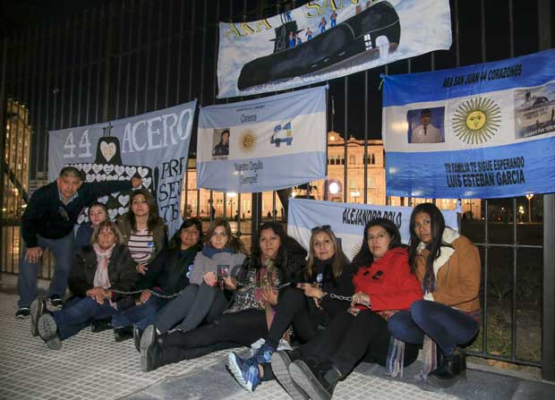 Familiares de algunos de los 44 tripulantes del submarino ARA San Juan se encadenaron hoy en la Plaza de Mayo, con el objetivo de que el Gobierno acelere los pasos para licitar a una empresa que continúe con la búsqueda de la nave marítima, desaparecida el pasado 15 de noviembre.