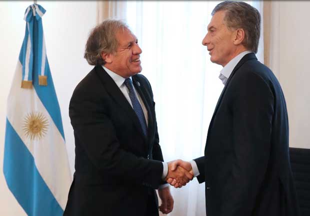 Macri se reunió con Almagro en la residencia de Olivos, donde dialogaron "sobre diversos temas de la agenda regional", haciendo hincapié "especialmente" en las situaciones que atraviesan los pueblos nicaragüenses y venezolanos.Según se informó oficialmente, el jefe de Estado recibió un informe elaborado por un panel de expertos independientes, designados por Almagro, que concluyeron que existe fundamento suficiente para considerar que se han cometido crímenes de lesa humanidad en Venezuela, por lo menos desde el 12 de febrero de 2014.Almagro llegó a la quinta presidencial tras participar en la sede de AMIA del acto realizado en memoria del atentado ocurrido hace 24 años que se cobró la vida de 85 personas.Está previsto que el presidente Macri permanezca en Olivos y esta tarde a las 18:00 brinde una conferencia, informa Noticias Argentinas.