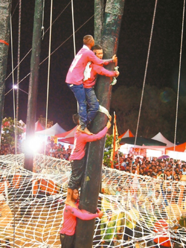 Los miembros de estos equipos tuvieron que librar una ardua batalla para tratar de trepar un palo untado con 250 kilos de mantequilla, haciéndolo sumamente resbaloso. Al inicio, los equipos hicieron una especie de escalera humana, donde el que estaba en el tope de la misma procuraba aferrarse al palo para seguir con su hazaña hacia la cima del palo, donde aguardaba un premio de diez mil dólares estadounidenses. Esta tradicional competencia se realiza en ocasión de celebrarse el Festival de las Ánimas.