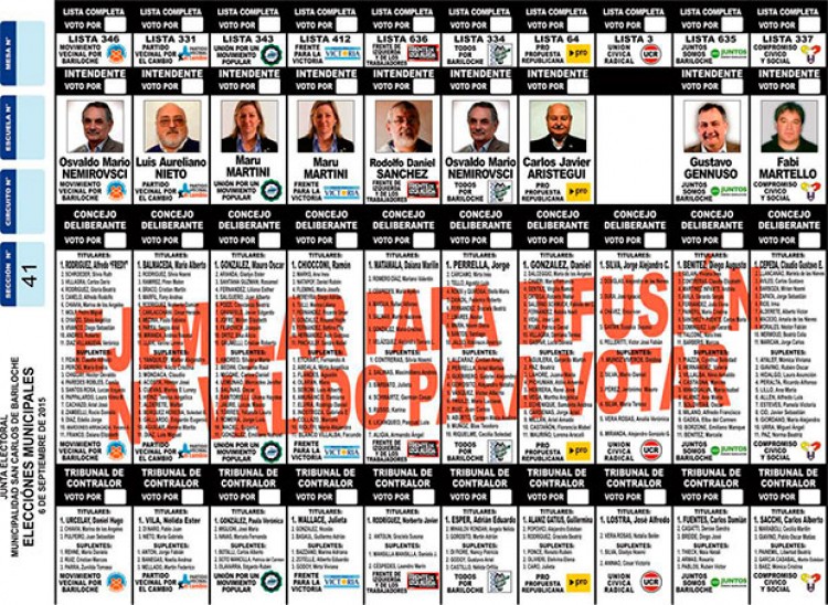 Lo más destacado de estos comicios será la implementación de esta boleta por tratarse del mismo sistema que la oposición reclama a nivel nacional y en forma complementaria para los comicios de octubre.En el caso de Bariloche, se trata de una boleta que mide 53 centímetros de largo por 34 de ancho y lleva 286 candidatos para 15 cargos electivos: intendente, once concejales y tres integrantes del Tribunal de Contralor comunal.La intendenta María Martini intentará se reelecta por el Frente para la Victoria tendrá entre sus principales rivales a Gustavo Gennuso de Juntos por Bariloche, el espacio que apoya el gobernador de Río Negro, Alberto Weretilneck.También competirán por la Intendencia el exdiputado Osvaldo Nemirovsci, del Movimiento Vecinal; Carlos Aristegui, por Cambiemos-PRO; Roberto Martello por Compromiso Cívico y Social; Luis Nieto, por el Partido Vecinalista por el Cambio y Rodolfo Sánchez, por el Frente de Izquierda.Tanto Martini como Nemirovsci aparecerán en dos listas colectoras: la intendenta encabeza, además de la nómina del Frente para la Victoria, la de Unión por un Movimiento Popular, y su competidor figurará en la de Todos por Bariloche.En tanto, la UCR y el Partido Socialista no presentan candidatos a intendente y competirán sólo con postulantes a concejales. El padrón electoral de Bariloche está conformado por 92.214 personas, que votarán en las 272 mesas que se distribuyeron en el distrito para estos comicios.La realización de las elecciones se da luego de que el Tribunal Electoral Provincial suspendiera el cambio de fecha que había dispuesto la intendenta Martini, quien alegó "irregularidades" con la confección de la boleta única.Sin embargo, los jueces con competencia electoral hicieron lugar días atrás al recurso de amparo impuesto por la alianza Juntos Somos Bariloche, que pidió la nulidad de la resolución dictada por la Municipalidad.Fuente: Agencia de Noticias NA