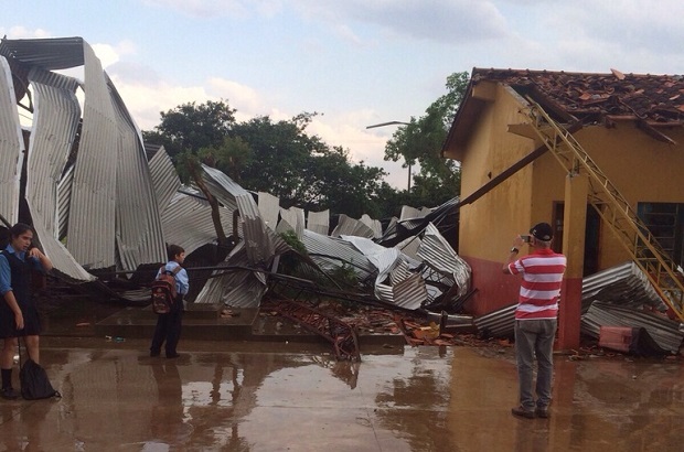 Un tornado de fuerza 1/2 azotó con fuerza este lunes por la tarde a la región paraguaya de Canindeyú, al Norte de la zona oriental del país y a menos de 300 kilómetros de Puerto Iguazú.Así lo informó el meteorólogo aficionado Marcelo Kusik, en base a datos procedentes del Centro Operativo de Emergencia (COE) de Encarnación.Como consecuencia del temporal, que también incluyó fuerte caída de granizo, la Escuela Básica 6.636 Maria Auxiliadora, de la localidad de La Paloma, quedó gravemente dañada, con cinco aulas muy deterioradas y el tinglado totalmente destechado.Por fortuna, los 202 alumnos el nivel inicial hasta noveno grado que se encontraban en clases a esa hora, alrededor de las 14:45, no sufrieron daños.Tampoco se informó de mayores afectaciones en otras instalaciones.