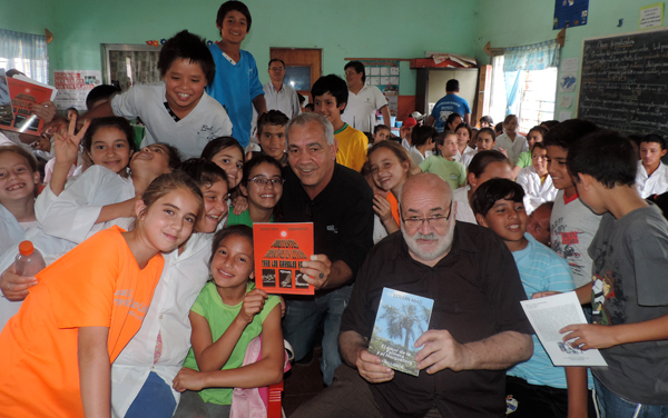SAN PEDRO. En la puerta de acceso al predio de la escuela 144 “Granadero Santiago Guaychá” esperaba a los integrantes de la “Gira Poético Literaria” un comité de recepción del que participaron la directora de la escuela, Liliana Tabaczuk, el vicedirector Miguel Ángel Leguizamon y la docente de séptimo grado Zara Vadillo. Silenciosa atención Cruzando un extenso patio se entra a un aula donde ya estaban preparados los elementos técnicos que aportó Claudio Benítez; allí fue armada la mesa de los libros y fueron entrando los chicos de cuarto, quinto y sexto grado. Fueron más de cien, y se amucharon sentados en sillas, bancos y hasta en el piso. Estaban sorprendidos y llenos de curiosidad por estos hombres que habían llegado de lejos con muchos libros, micrófonos, pantalla y proyector de video y que empezaron mostrándoles un video de Misiones. Silencio total. Algunos tomaron mate y otros tereré. La atención estuvo puesta en los que les hablaron de libros y de cosas distintas a las que ellos perciben cotidianamente en San Pedro. Finalizado el video y la charla se armaron “barras” que corearon el nombre de los visitantes. Los chicos acercaron cuadernos, libretas, hojas de papel para que les dejen un mensaje con firma, recuerdo de este día que pasaron el miércoles 2 de septiembre. Y algunos hasta pidieron “¿me firma el guardapolvo señor?”Los agradecimientos por la visita, los aplausos y esas muestras de afecto emocionaron a los miembros de la “Gira…”. “Nos vamos aunque quisiéramos quedarnos un rato más”, dijeron a manera de despedida Isaac Sevi y Esteban Abad, quienes pensaron muy en silencio que, ahora, algo más de cien chicos, un grupo de maestras, los directivos y el personal de la escuela 144, conocen algo más de las letras misioneras.Ellos (Sevi, Abad, Small, Benítez y el nuevo integrante Santiago), un poco más de lo que es la cordialidad y el afecto de la gente del interior misionero.