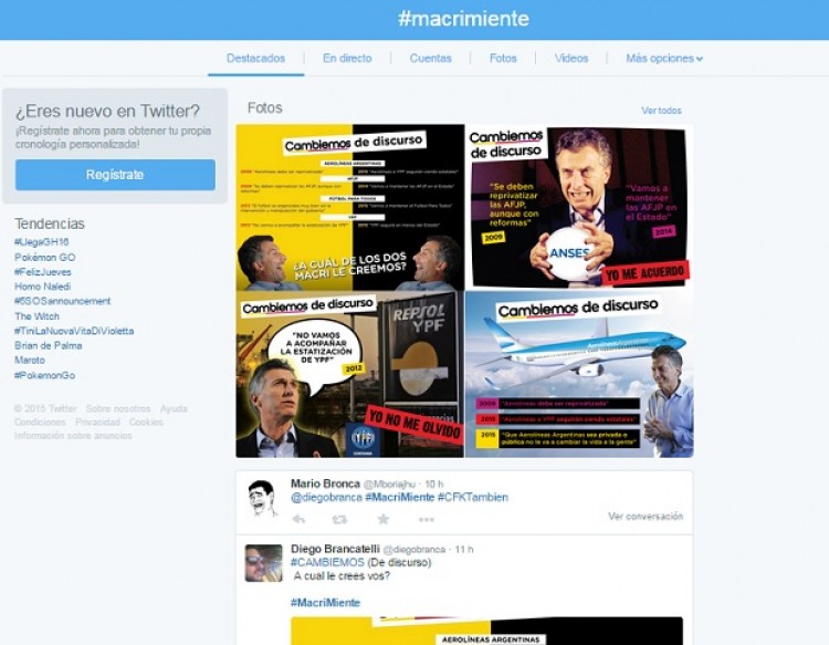 El secretario de Comunicación Pública bonaerense, Juan Courel, se sumó este jueves a las críticas que el sciolismo efectuó contra el jefe de Gobierno porteño, Mauricio Macri, al acusarlo de un "cambio discursivo".   "Dice una cosa y hace otra. Cambia de discurso todos los días. Eso se llama mentir. Hablan de cambiar y lo único que cambian es el discurso", escribió en su cuenta de Twitter el coordinador de los contenidos de la campaña de Daniel Scioli, acompañado del hashtag #MacriMiente.   En las últimas horas aparecieron en las redes sociales una serie de gráficas exponiendo las contradicciones discursivas de Mauricio Macri.   Bajo el hashtag #CambiemosDeDiscurso distintos usuarios de Facebook y Twitter compartieron ejemplos del cambio de posturas del candidato del frente Cambiemos en temas como YPF, la Asignación Universal por Hijo (AUH), ANSeS, Aerolíneas Argentinas, Arsat y Fútbol para todos.Fuente: Agencia de Noticias NA
