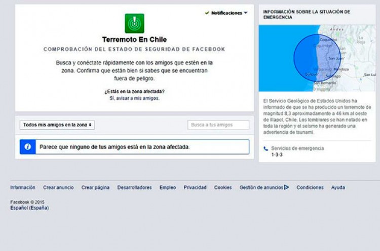 Mientras tanto, gran parte de los evacuados fueron trasladados a zona altas de ciudades costeras ante la alerta de sunami, que se mantenía vigente para varias regiones en la madrugada de este jueves. La red social habilitó este sistema para tranquilizar a los familiares, amigos y personas cercanas, tras el terremoto que afectó a ocho regiones del centro y norte del país. A través de la app Safety Check (Comprobación del estado de seguridad) , los usuarios de Facebook pueden comunicarse con sus contactos durante una catástrofe."Avisa a tus amigos que te encuentras fuera de peligro. Confirma que estás bien para que reciban una notificación", señala el mensaje del sitio web. "Busca y conéctate rápidamente con los amigos que estén en la zona. Confirma que están bien si sabes que se encuentran fuera de peligro", sugiere la red social creada por Mark Zuckerberg.La herramienta emplea la geolocalización para ubicar a los usuarios que, en este caso, se encuentren en Chile. Los mensajes, que ya han empezado a circular masivamente por las redes sociales, solicitan que se indique si se encuentran bien y, a continuación, a medida que cada uno va indicando su estado, se incorporan a una lista de la situación en la que se encuentran los amigos.Quienes viven en Chile -y así lo han especificado en su perfil de Facebook- han recibido durante la noche una notificación que les pide que confirmen que están “bien”. “Avisa a tus amigos de que te encuentras fuera de peligro”, dice una ventana que les aparece a estos usuarios: en ese momento, todos sus amigos reciben la notificación. Al mismo tiempo, la red social les informa de la lista de contactos que están en Chile y que aún no han publicado cómo están.Para acceder a la herramienta y revisar los contactos o notificar la situación, ingresa a la página del Terremoto de Chile 2015 La presidenta Michelle Bachelet decretó zona de catástrofe para la provincia de Choapa (norte), donde se localizó el epicentro del sismo, lo cual implica que dicha región queda bajo mando militar y el Estado entregará mayores recursos a la localidad para atender la emergencia. La mandataria anunció en conferencia de prensa que viajaría este jueves a la zona del siniestro "para ver cuáles son las necesidades de apoyo. Queremos hacer una evaluación precisa en terreno".Fuente: Agencia de Noticias y Medios digitales