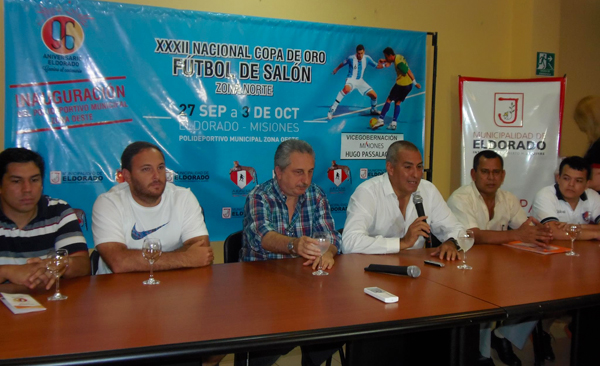 ELDORADO. En lo que será sin dudas un hecho histórico para esta ciudad, por tratarse del mes Aniversario de la Capital del Trabajo y porque será con el cual se inaugurará oficialmente el nuevo y moderno Polideportivo Municipal Zona Oeste, ya se vive a pleno el XXXIII Torneo Nacional A de Clubes de Fútbol de Salón, Copa de Oro, el cual fue presentado en la tarde de ayer.La Municipalidad de Eldorado fue escenario del lanzamiento del certamen que contó con la presencia del vicegobernador Hugo Passalacqua, el intendente de Eldorado Norberto Aguirre, el director de Deportes Juan Manuel Bonasso, y el presidente de la Asociación Eldorado de Fútbol de Salón (Aefusa), Juan Da Rosa, y allí se brindaron todos los detalles del mismo. De la Copa de Oro intervendrán 22 equipos de toda la zona Norte del país y Misiones estará representado por cinco equipos, Inyeniería Lliskoba y Guacurarí, ambos conjuntos locales, Toco Madera de Montecarlo, Transporte Cáceres de Puerto Esperanza y Quimtex de Posadas. Todos ellos irán en busca del título y de los ascensos que pone en juego la Confederación Argentina de Futsal (CAFS) para la División de Honor.Las actividades comenzarán el sábado 26, por la tarde, con la reunión de delegados, donde se sortearán las zonas y se definirán cuáles irán a la subsede Montecarlo y cuáles quedarán en la Capital del Trabajo. Por lo que adelantó Da Rosa en conferencia “se armarían cinco zonas, dos con cinco equipos y tres con cuatro”.El domingo 27 en horas de la tarde, tras el corte de cinta que dejará inaugurado el nuevo Polideportivo, “uno de los mejores de la provincia”, como lo manifestó el vicegobernador en la cita con la prensa, se procederá a dar comienzo a los partidos.Durante toda la semana habrá actividad en doble turno, arrancando la jornada a las 10.El mandamás de la Aefusa aprovechó la oportunidad para “agradecer públicamente al vicegobernador y al intendente por las gestiones y permitir que Eldorado pueda organizar un Nacional después de muchos años”. Seguidamente añadió: “Estamos trabajando intensamente para finiquitar todo lo que se refiere a la organización, para que llegado el día comience a jugarse el torneo”. “22 equipos confirmaron y hay varios que son potencias de futsal”, sentenció.
