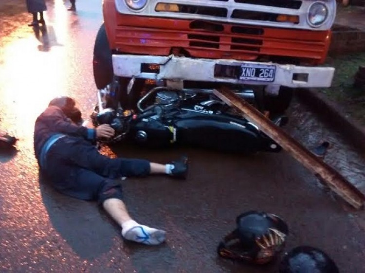 En la tarde del sábado, una motocicleta marca Ghigerri 150cc, que circulaba en contramano por la calle Belgrano de Apóstoles al mando de un joven de 23 años sufrió un aparatoso accidente al llegar a la intersección con la calle Tucumán y embestir frontalmente un camión marca Dodge 800 que se hallaba estacionado frente al domicilio de su propietario.A consecuencia del impacto, el conductor del rodado menor -identificado por la Policía como Isais David S., con domicilio en el barrio Irigoyen- sufrió lesiones graves, por lo que fue trasladado al hospital Ramón Madariaga de Posadas, con fractura expuesta y politraumatismo de cráneo.En el lugar se realizaron las pericias de rigor, se incautó la motocicleta y dos cascos, ya que el conductor circulaba acompañado de otro sujeto identificado como Ramón C, quien se negó a ser examinado.