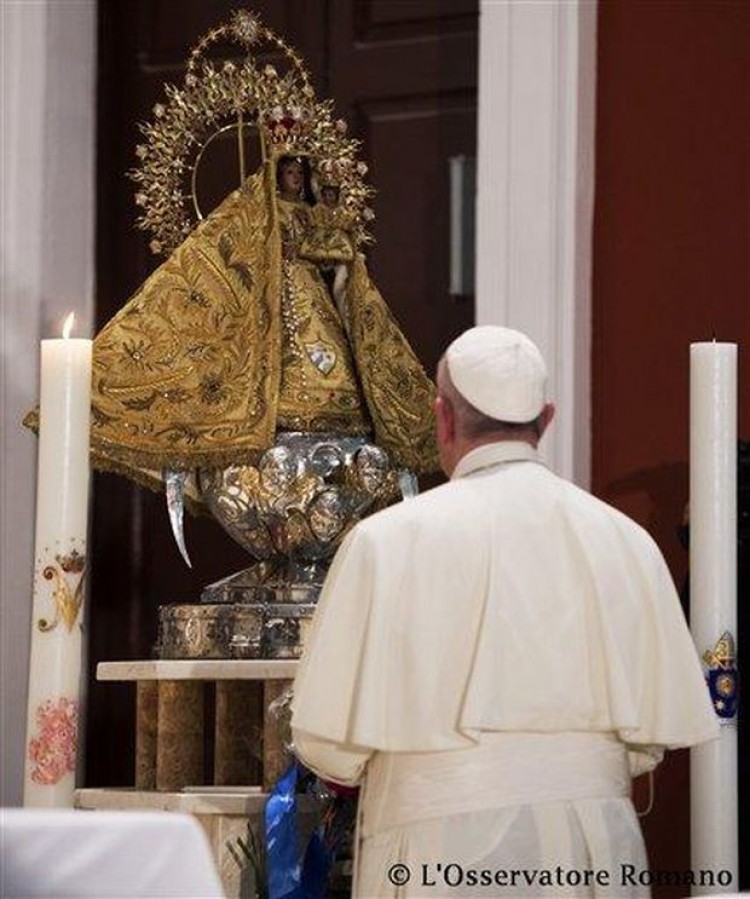 El papa Francisco llamó este martes a los cubanos a vivir una "revolución" de ternura y de ayuda a los demás.En un país donde el triunfo de la revolución de 1959 encabezada por Fidel Castro llevó a la isla a un proceso de laicismo, el pontífice dijo que la Virgen de la Caridad y patrona de todos los cubanos siempre los invita a querer y apoyar a los demás."Nuestra revolución pasa por la ternura, por la alegría que se hace siempre projimidad, que se hace siempre compasión, que no es lástima… y nos lleva a involucrarnos, para servir, en la vida de los demás.El papa Francisco rinde este martes en su última jornada en la isla caribeña un homenaje a la virgen de la Caridad, un símbolo de unidad de los cubanos por encima de sus ideas políticas y lugares de residencia.El pontífice oficiará su tercera y última misa en la Basílica del santuario a la virgen y sostendrá un encuentro con familias antes de viajar a Estados Unidos, en busca de tender un puente entre ambas naciones en medio de un proceso de normalización de las relaciones."Se convirtió en una guía para los mambises (los independentistas isleños del siglo XIX) y a ella se le pide consuelo y protección", dijo Idania Castillo, una artesana de 51 años residente en el Cobre, un poblado a unos 30 kilómetros de la oriental ciudad de Santiago donde se encuentra el santuario de la Virgen de la Caridad."Ella logra el milagro de la unidad de los cubanos, hasta los ateos. El amor a ella nos une. Yo siempre digo que es una fuerza", dijo.El papa pernoctó el lunes en un convento remodelado a un costado de la Basílica que guarda la imagen sagrada, que también es identificada como Oshun por parte de los religiosos de la Santería sincrética afrodescendiente.Francisco, quien llegó a Cuba el sábado en una visita que busca unir las dos orillas del Estrecho de la Florida, dará una misa allí, antes de viajar a Estados Unidos este martes por la tarde."En las mejores familias hay sus rechazos y enemistades y ella (la Virgen) puede lograr la cohesión de todos los miembros", agregó Castillo, emocionada por la vivista del pontífice.Muchos cubanos que viven en Estados Unidos son tan devotos de la Caridad como los residentes en la isla y suelen venir a peregrinar ante su altar de mármol blanco y marrón, a donde incluso se dejan ex votos y promesas.Para algunos no escapa el trasfondo político que también tiene la asistencia del Santo Padre al Santuario, en momentos en que Cuba y Estados Unidos negocian un acercamiento que comenzó en diciembre pasado y ya logró el restablecimiento de relaciones diplomáticas en julio pasado tras cinco décadas de enfrentamiento.Los presidentes Raúl Castro y Barack Obama agradecieron públicamente a Francisco por su labor de facilitador del deshielo."Es un honor haber tenido tres papas en Cuba, un país tan pequeño, es algo grandioso. (Francisco) vino a bendecirnos y eso lo convierte en un tributo a los cubanos todos", dijo Roberto Lozada, un administrador de negocio de 50 años, también residente en el poblado del Cobre.A su lado, su padre, Rolando Lozada de 73 años agregó: "La Virgen puede hacer que se coja otro camino (en las relaciones entre Cuba y EEUU) y que se quite todo este fenómeno, el bloqueo, para que salgamos adelante los cubanos".Washington mantiene un fuerte paquete de sanciones contra Cuba desde la década de los 60, tras el triunfo de la revolución liderada por Fidel Castro, presionando por cambios en el sistema político de la isla.Obama reconoció que la política de embargo fue un fracaso, pero sectores del Congreso estadounidense, de quien depende levantar las medidas que son leyes, se niegan a un acercamiento.Precisamente el papa hablará ante el legislativo norteamericano durante su viaje.Además, la agenda del papa para este martes contempla como última actividad en la isla un encuentro con familias, antes de su salida directa a la capital estadounidense.Los días anteriores el pontífice realizó dos misas masivas -una en La Habana y otra en Holguín- y se reunió con el presidente Castro y su hermano el líder Fidel Castro, además se entrevistó con jóvenes y religiosos.