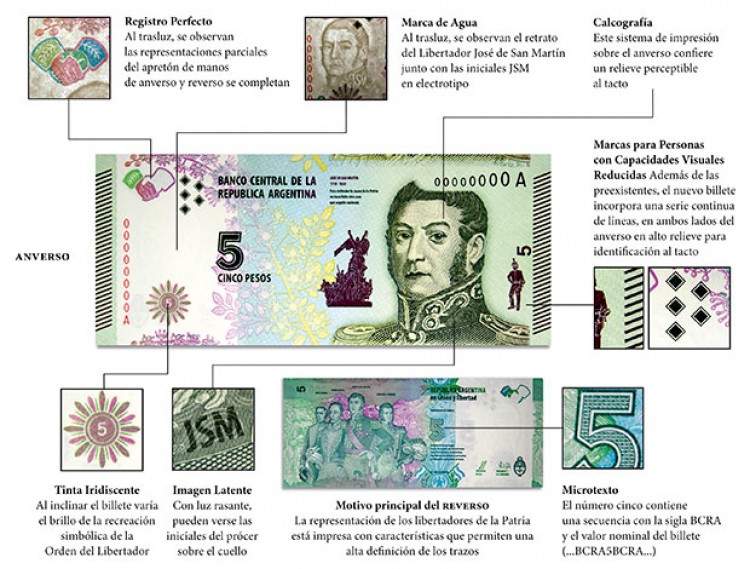 Según informó el BCRA, los billetes de nuevo diseño coexistirán en su uso con los actuales vigentes de esa denominación, y serán distribuidos a través de las entidades financieras mediante los mecanismos habituales.El nuevo billete presenta en su anverso el retrato de San Martín en uniforme militar, y como fondo de seguridad una trama con la representación del sable corvo del prócer. En el centro superior se lee "BANCO CENTRAL DE LA REPÚBLICA ARGENTINA – JOSÉ DE SAN MARTÍN 1778 – 1850" (natalicio y muerte).  Debajo de estas fechas: "Para defender la causa de la Patria no hace falta otra cosa que orgullo nacional". A su vez, en el reverso del billete se observa la imagen principal conformada por las figuras de los Libertadores de América: José de San Martín, José Gervasio Artigas, Simón Bolívar y Bernardo O’Higgins. El motivo se completa con la leyenda: "Divididos seremos esclavos, unidos estoy seguro que los batiremos: hagamos un esfuerzo de patriotismo, depongamos resentimientos particulares, y concluyamos nuestra obra con honor". El tamaño del billete es idéntico al de 5 pesos que circula actualmente. En materia de seguridad se distinguen las siguientes medidas para reconocimiento visual del público: Color predominante: verde; Marca de agua: localizada, con el retrato de San Martín y sus iniciales –JSM- en electrotipo.Además cuenta con identificación para personas con capacidades visuales reducidas: en el anverso, además de los cinco pequeños cuadrados en relieve que indican el valor del billete, se incorporaron nuevas marcas en los márgenes derecho e izquierdo. Tinta iridiscente: ubicada en la parte inferior izquierda del anverso, en el motivo "Orden del Libertador", en cuyo centro se encuentra calado el valor 5. Imagen latente: localizada en el cuello del uniforme del  General Don José de San Martín, las letras JSM pueden apreciarse cuando se observa el billete con luz rasante.Fuente: Agencia de Noticias NA