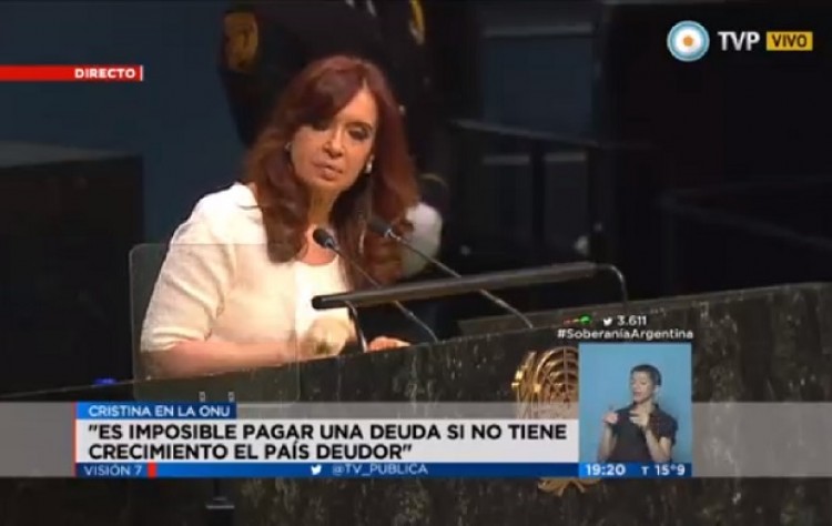 Cristina Fernández de Kirchner arrancó su alocución con renovadas críticas a los "fondos buitres" -a los que acusó de mantener una actitud de "hostigamiento" hacia la Argentina y porque "no cobran ni dejan cobrar" al resto de los acreedores-, recordando y agradeciendo la reciente resolución de la ONU que dio la razón a la Argentina en materia de deuda soberana.Aprovechó para "golpear" a los responsables de la caída en default en 2001 y del "quiebre de la institucionalidad", cuando en el mundo las finanzas todavía gozaban de buena salud, y se jactó de haber "retomado el rumbo de la economía" nacional a partir de 2003, con la primera gestión de Néstor Kirchner, quien en ese momento apeló a que "es imposible pagar la deuda si no crece la economía"."Allí comenzó el inexorable proceso de desendeudamiento y la Argentina se reenganchó en el vagón de los países emergentes", recordó.Cuestionó el sistema económico imperante, específicamente refiriéndose a Estados Unidos, "que fue el país de las oportunidades" y donde hoy -aseguró- "el 1% de la población concentra el 50% de la riqueza".A cambio, felicitó a EEUU -junto a Irán y los miembros de la Comisión Permanente de la ONU- por el acuerdo alcanzado en materia nuclear, pero también denunció al país del Norte por su supuesta falta de colaboración en el esclarecimiento del atentado contra la sede de la Amia."Si nosotros somos cómplices de Irán, ¿qué es el presidente Obama entonces?", disparó para rechazar las críticas que Argentina recibió por firmar el memorándum de entendimiento y cuestionar el "doble estándar en materia diplomática" de los estadounidenses, asegurando que el exdirector de operaciones de la exSide, Antonio "Jaime" Stiuso, está "protegido" en ese país."No podemos seguir utilizando armas de intriga internacional dignos de John Le Carré", agregó.Además, definió los fundamentalismos -"de cualquier índole: dogmáticos, religiosos…"- como "uno de los peores flagelos que tiene hoy la humanidad", especialmente "los que consideran al prójimo como un enemigo, como un objetivo a eliminar".