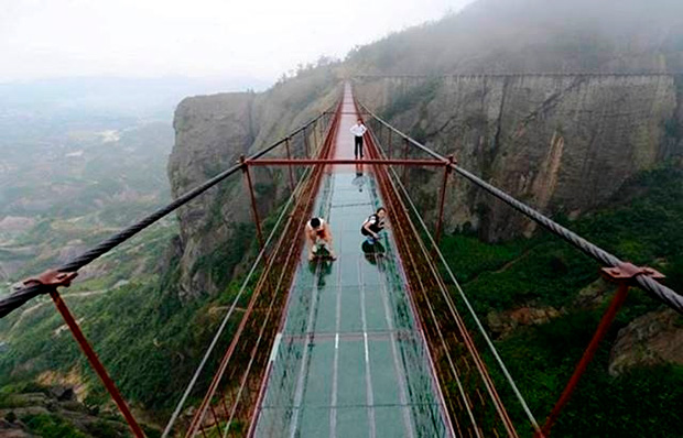 La plataforma, que está por encima de un precipicio en la provincia central de Hunan, en China, es conocida como Haohan Qiao y es la última de una serie de atracciones con el piso de cristal que se han inaugurado en el país asiático y en el resto del mundo.A pesar del pánico que provoca, sus creadores dicen que el puente en el Parque Nacional Geológico Shiniuzhai es perfectamente seguro. Cada uno de los paneles de cristal tiene 24 milímetros de grosor y es 25 veces más fuerte que el convencional."El puente que construimos se mantendrá firme incluso si los turistas saltan sobre él", dijo un trabajador que construyó el puente al servicio estatal de noticias de China."El marco de acero usado para sostener y encerrar el puente de cristal es también muy fuerte y fue construido densamente, de manera que, incluso, si un cristal se rompiera, los viajeros no se caerían a través de él".Haohan Qiao era originalmente un puente de madera antes de que el parque experimentara al reemplazar una pequeña sección con cristal en el 2014. Este decidió aumentar la emoción modernizando todo el paso elevado, convirtiéndolo en el primer puente colgante de China construido totalmente de cristal.El grupo de turistas que se atrevió a cruzarlo pasó momentos de verdadero horror para terminar su camino. Algunas personas fueron literalmente arrastradas por sus compañeros para terminar del recorrido.Fuente: Medios digitales