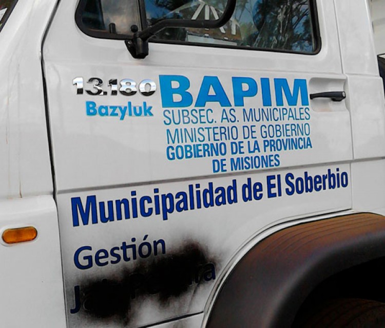 Un joven y un adolescente fueron aprehendidos en momentos en que tapaban con pintura el crédito político de un camión volcador en exhibición perteneciente a la Municipalidad de El Soberbio.Según se informó desde la Policía, sucedió en la noche del último viernes sobre la avenida Rivadavia de esa localidad, hasta donde los uniformados llegaron tras el alerta de vecinos de la zona.En ese lugar fueron demorados un joven de 19 años y su presunto cómplice, de 17, acusados de actos vandálicos. Al parecer, ambos taparon con pintura en aerosol la leyenda que “decoraba” un camión volcador adquirido por la comuna local, que se encontraba en exhibición en la vía pública y en los próximos días entraría en servicio.Ante esta situación, los dos fueron trasladados hasta la dependencia local, donde quedaron a disposición de la Justicia provincial. Los policías habrían decomisado la lata de pintura, que estaba en poder de los sospechosos.
