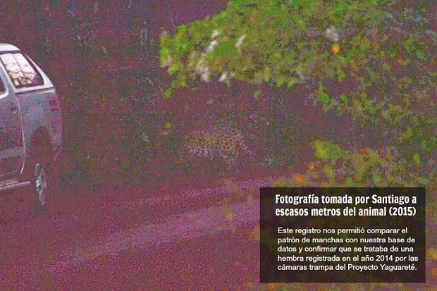 Ver un yaguareté es una de las experiencias más emocionantes que le puede suceder a alguien que visita un área natural. Ese fue el caso de Santiago, que una tarde alrededor de las 19:00 se encontraba fotografiando aves en el Parque Nacional Iguazú y pudo contemplar al animal cruzando a escasos metros de él. Pero no solo eso: también lo fotografió. A pesar de que la imagen tomada resultó salir muy oscura, fue suficiente para confirmar que efectivamente se trataba de un yaguareté.La fotografía fue analizada por los expertos del Proyecto Yaguareté, quienes compararon las manchas del animal con todos los registros fotográficos que disponen en su base de datos. De esta manera pudieron confirmar que se trata de una hembra bautizada con el nombre de "Tacuara", que fue registrada en 2014 por las cámaras trampa que utilizan para sus investigaciones sobre la especie, cerca del lugar donde se produjo el avistaje en esta ocasión.El dato que facilitó el turista a los investigadores que estudian esta especie es de gran importancia para seguir actualizando la base de datos de yaguareté y saber por dónde se mueven estos animales.