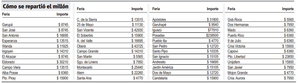 Por su parte, el director de Agricultura Familiar del Ministerio del Agro de la Provincia, Ricardo Buiak, sostuvo en una entrevista con este Diario: “No sé cuáles son los criterios, tampoco sé exactamente lo que hicieron con el millón que recibieron. En alguna gestión sé que invirtieron en semillas, según supe, cada zona tuvo su criterio”. Igualmente reconoció que “no alcanzó para muchos, en el caso de Posadas por ejemplo, que son más de 400 feriantes, por supuesto que es difícil que alcance”.