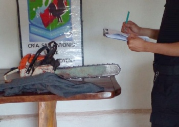 Read moreLA REMERA. La motosierra con manchas de sangre y restos de una prenda que trabó la cadena y evitó lo ...